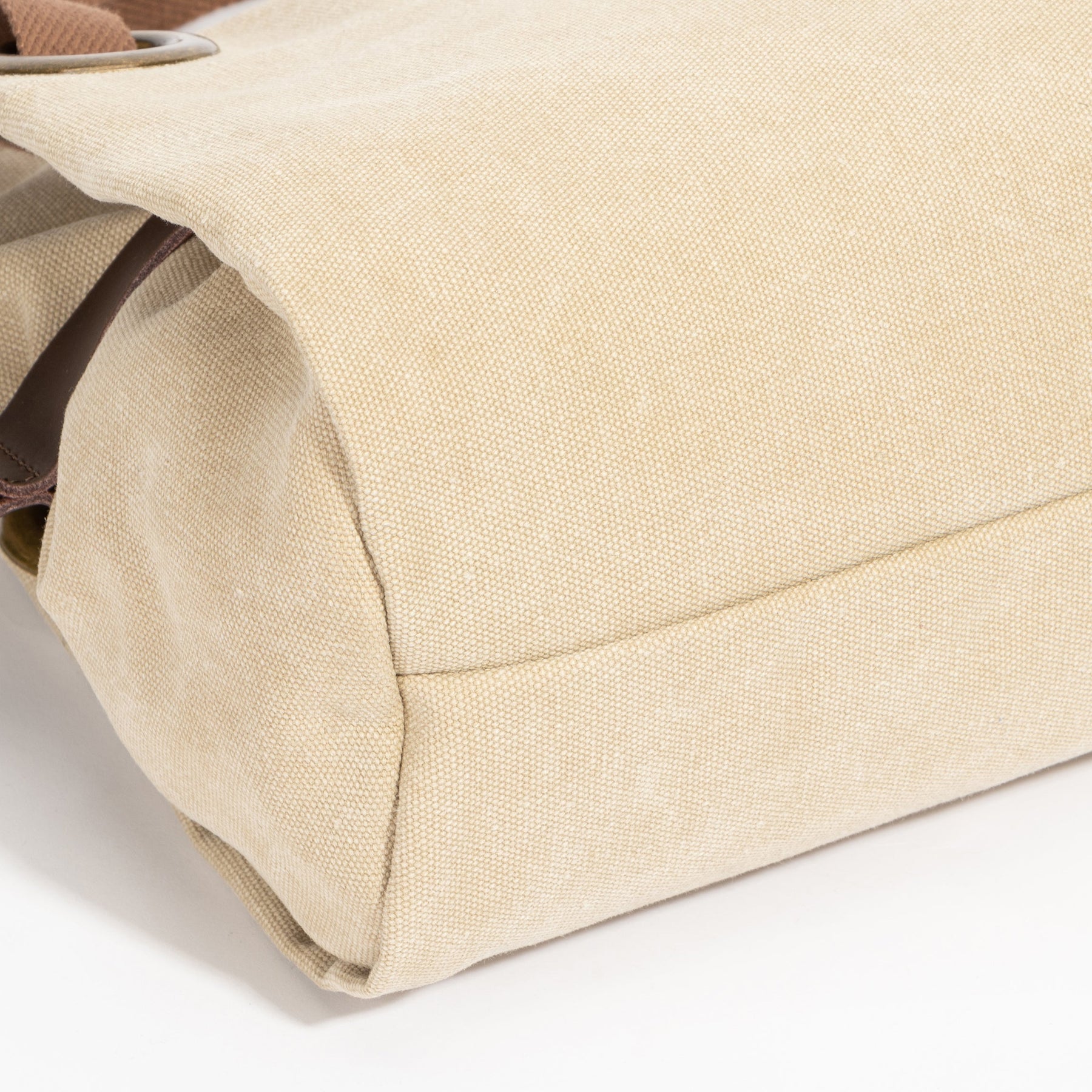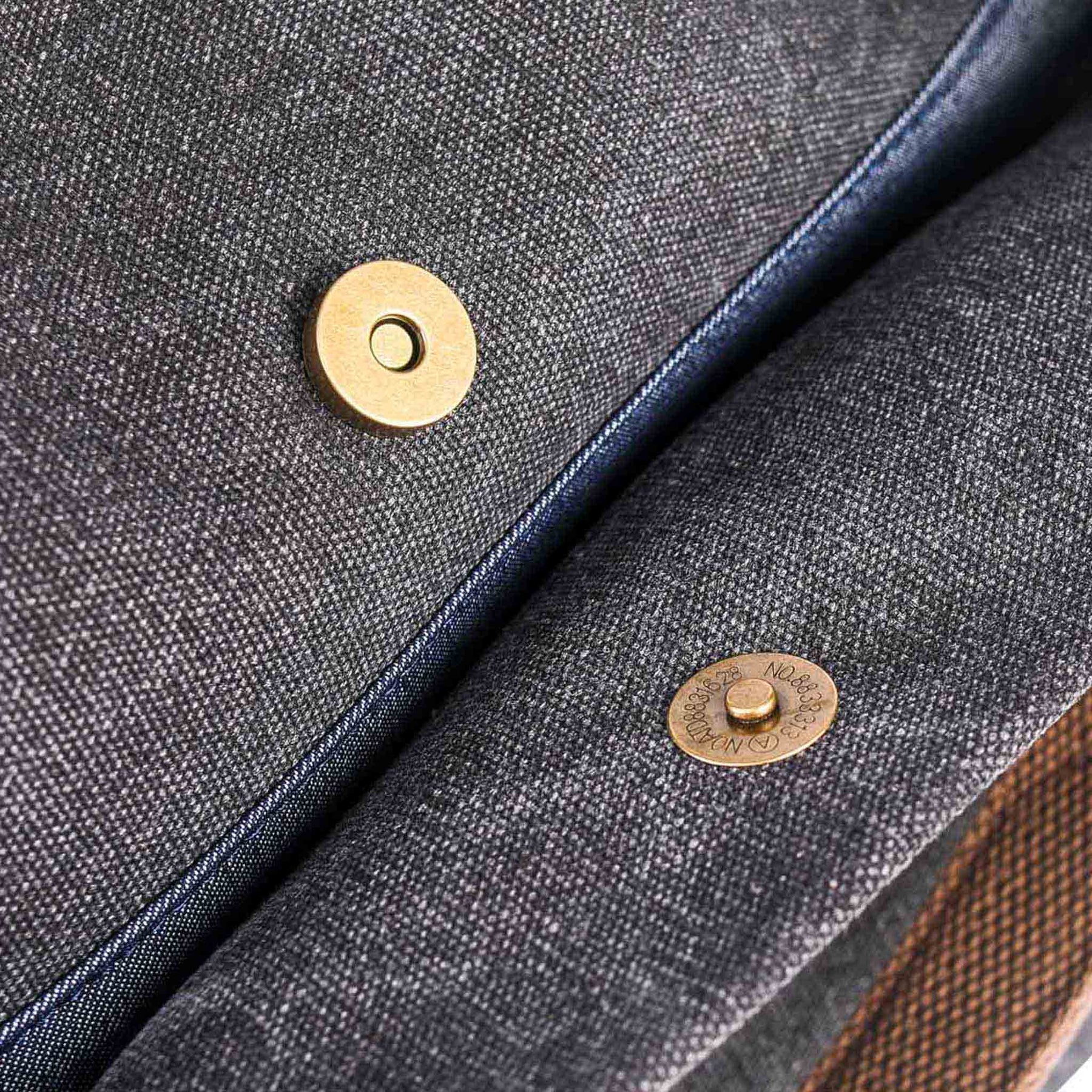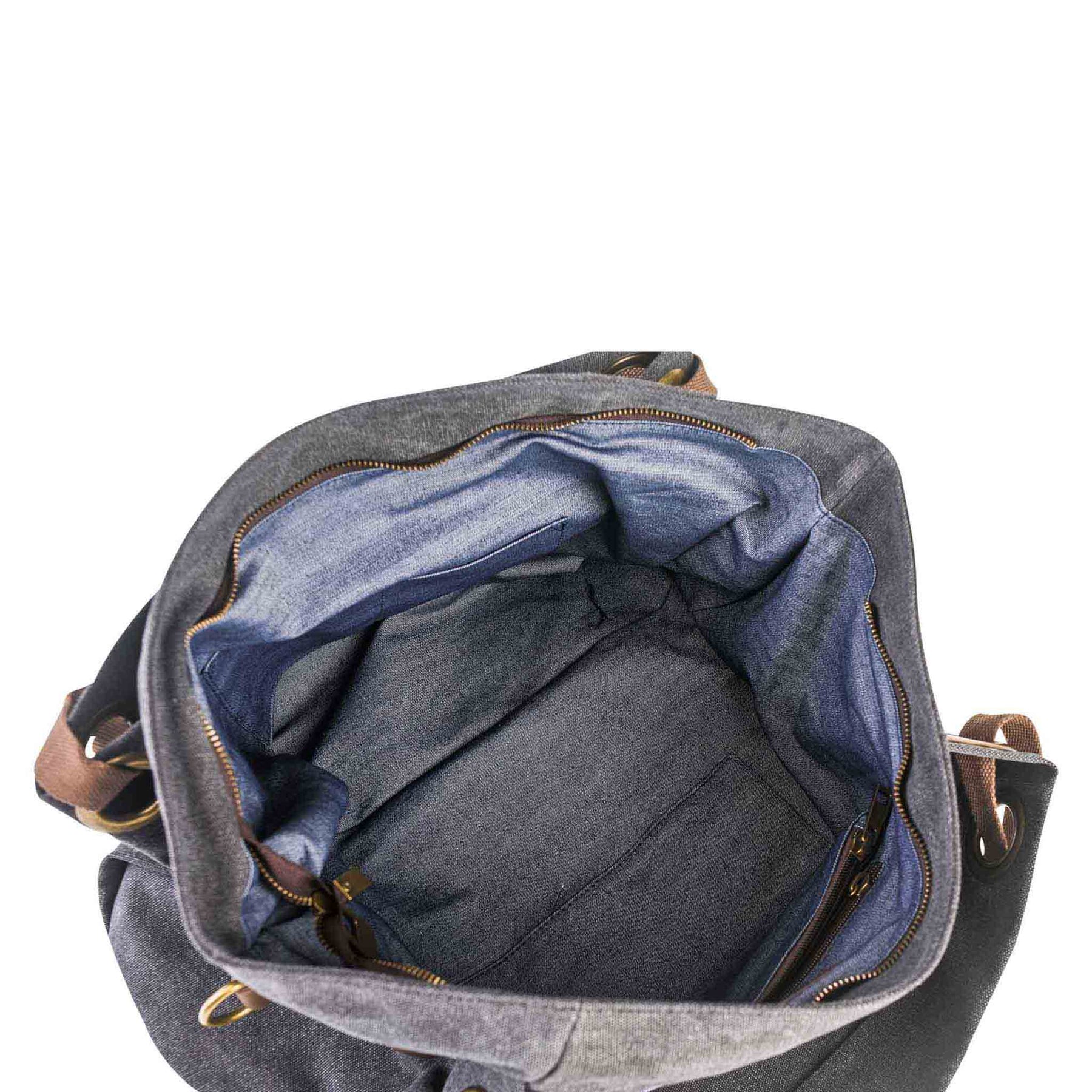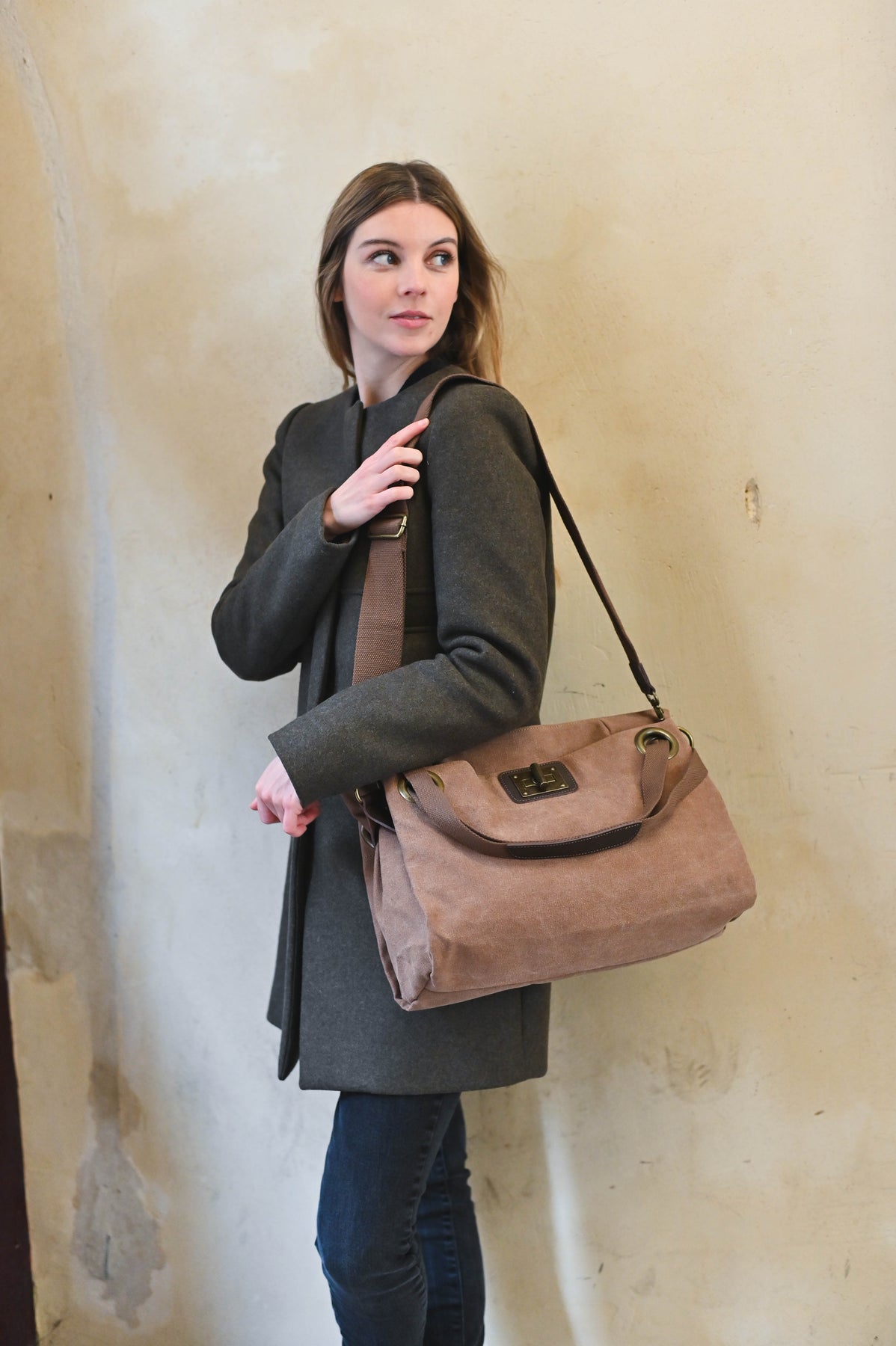 Die Tasche aus gewaschener Baumwoll-Canvas und Spaltleder vereint Weichheit und Authentizität. Die Griffe aus einer Mischung aus Canvas und Leder sorgen für optimalen Tragekomfort. Im Inneren verfügt die Tasche über fünf Innentaschen, darunter zwei mit Reißverschluss, eine große Rückentasche mit Magnetverschluss und eine geräumige Fronttasche mit Knebelverschluss.