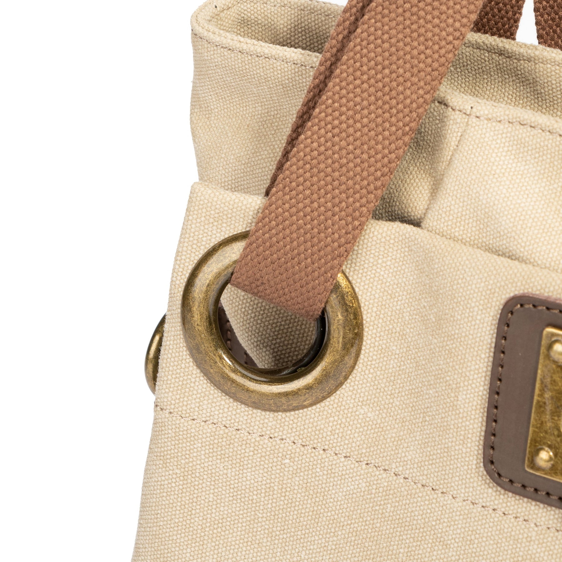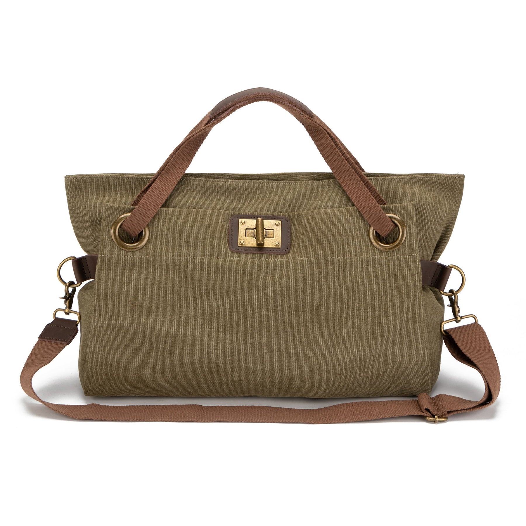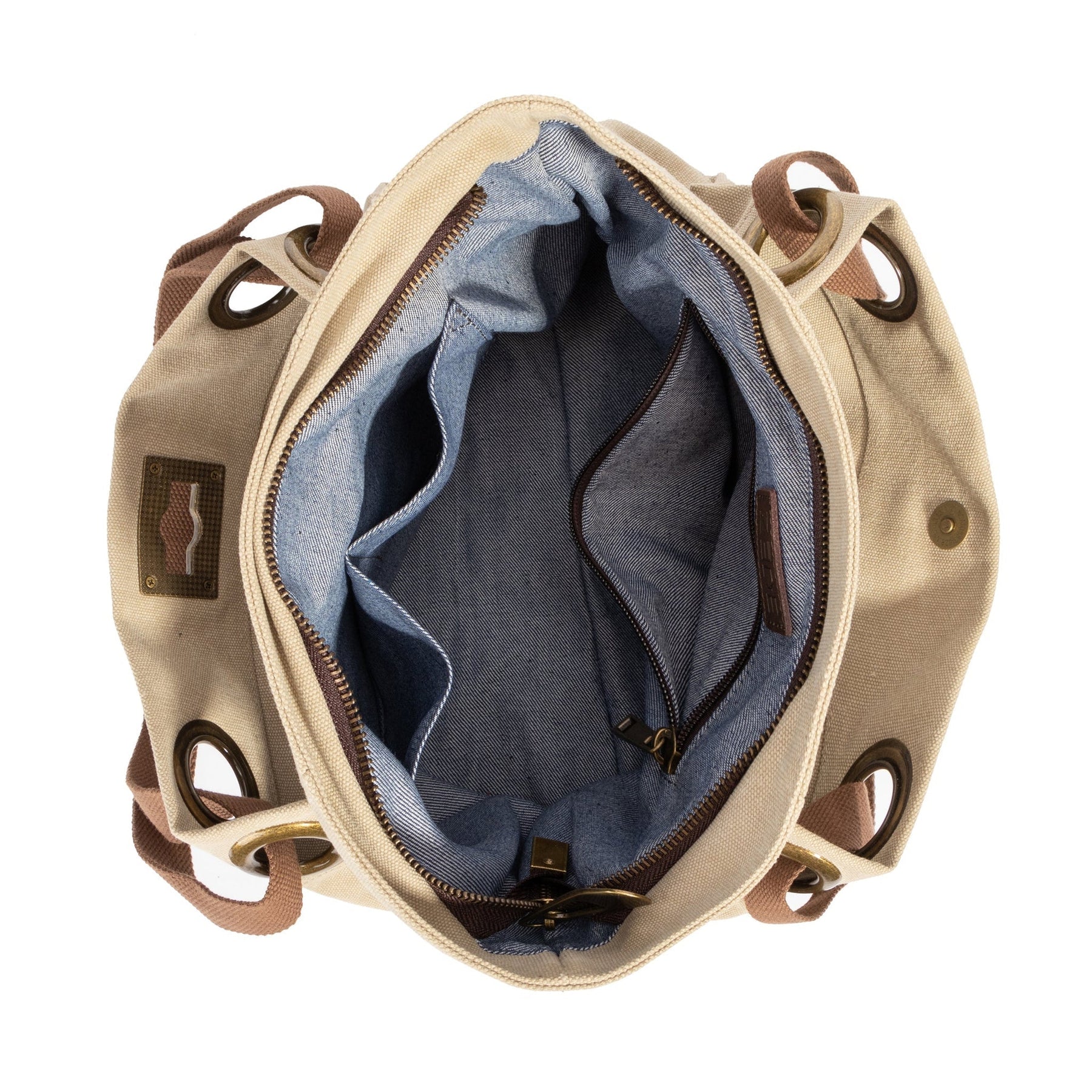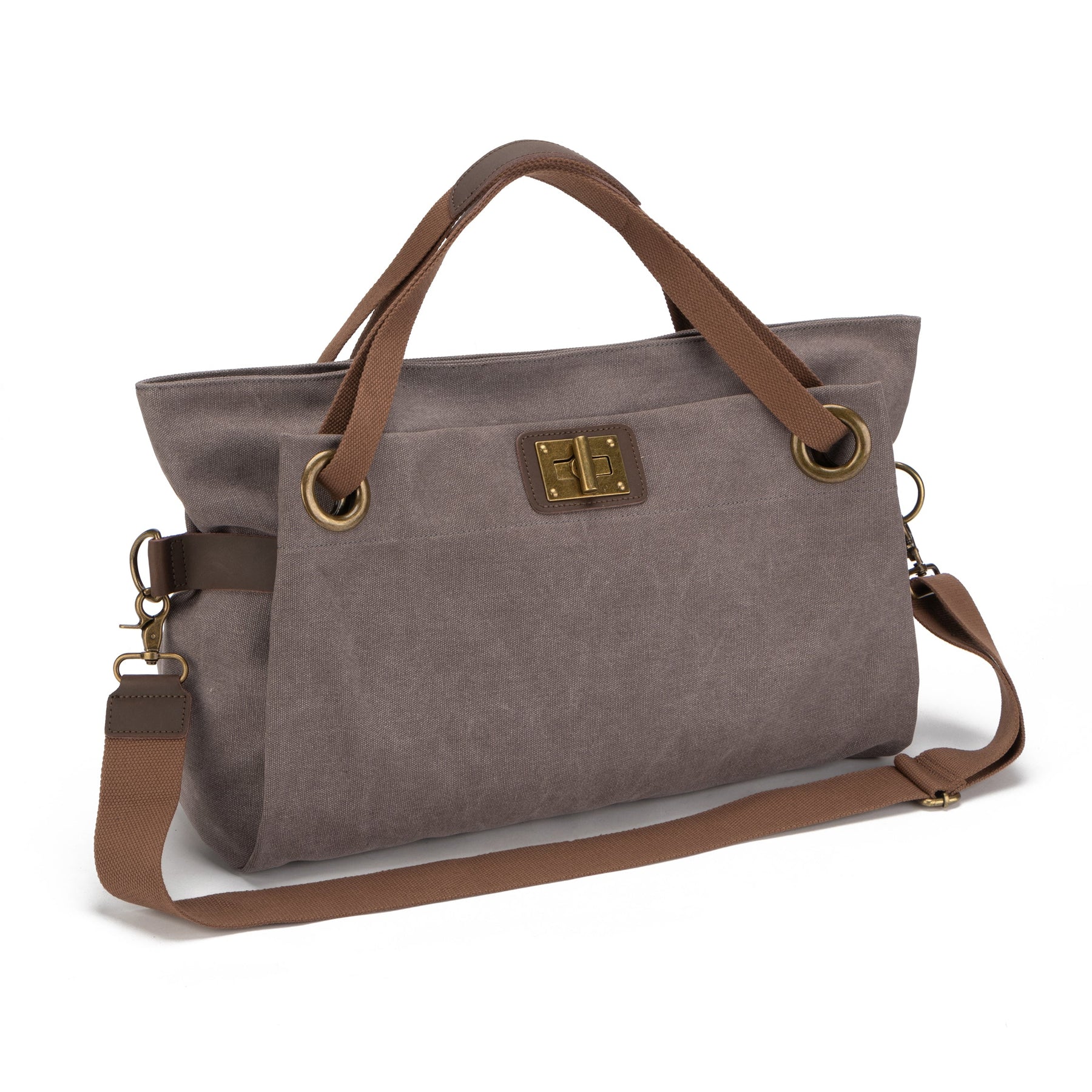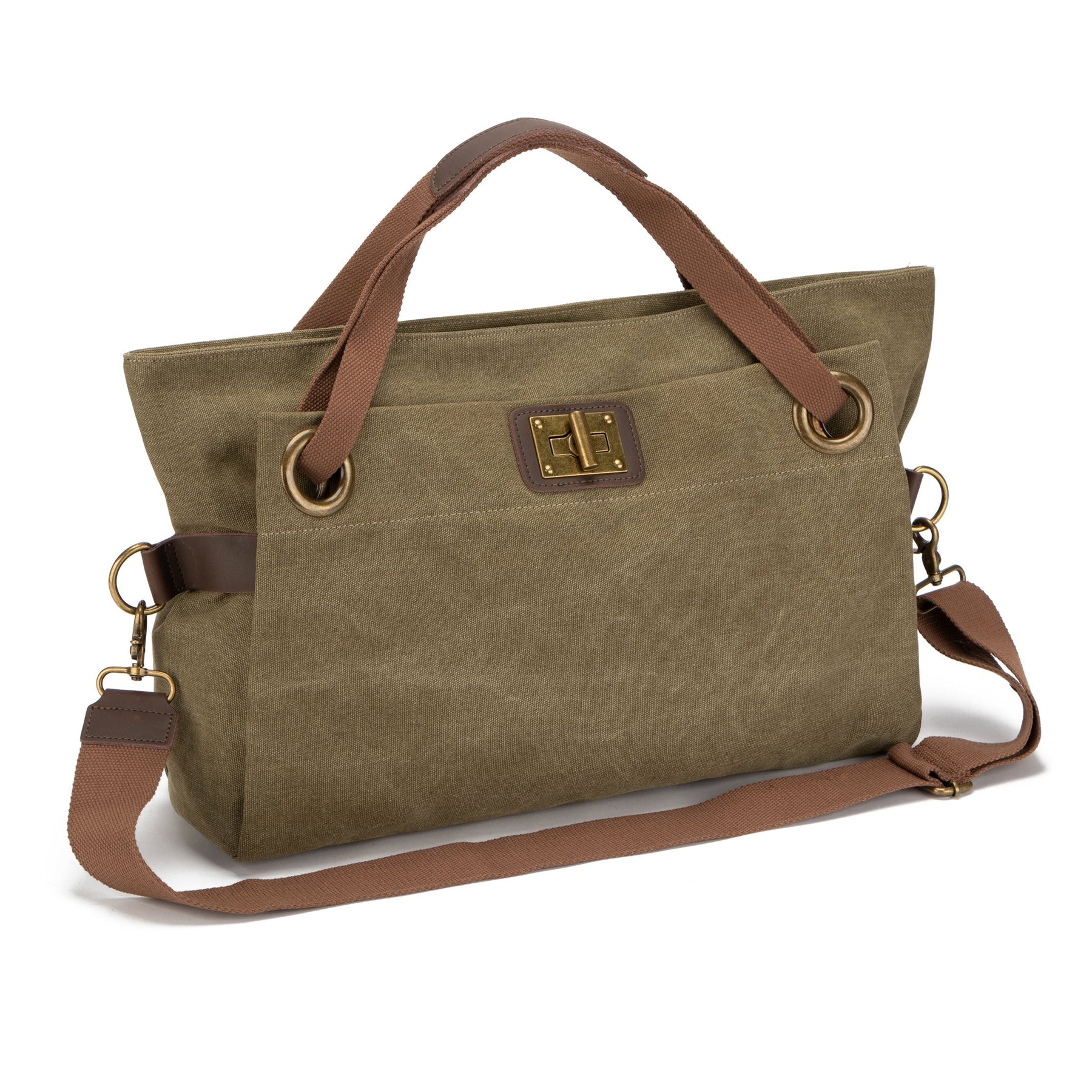 Die Tasche aus gewaschener Baumwoll-Canvas und Spaltleder vereint Weichheit und Authentizität. Die Griffe aus einer Mischung aus Canvas und Leder sorgen für optimalen Tragekomfort. Im Inneren verfügt die Tasche über fünf Innentaschen, darunter zwei mit Reißverschluss, eine große Rückentasche mit Magnetverschluss und eine geräumige Fronttasche mit Knebelverschluss.
