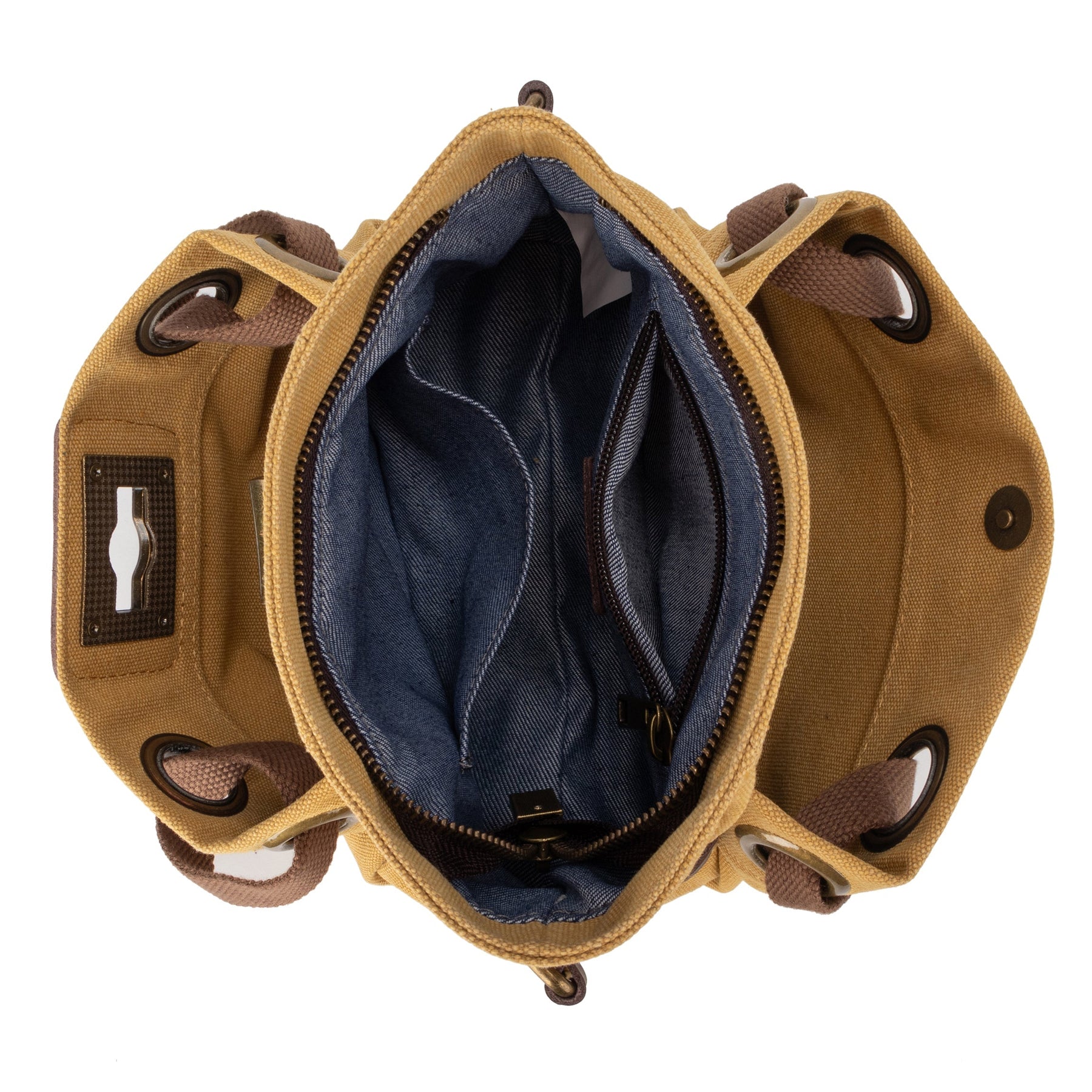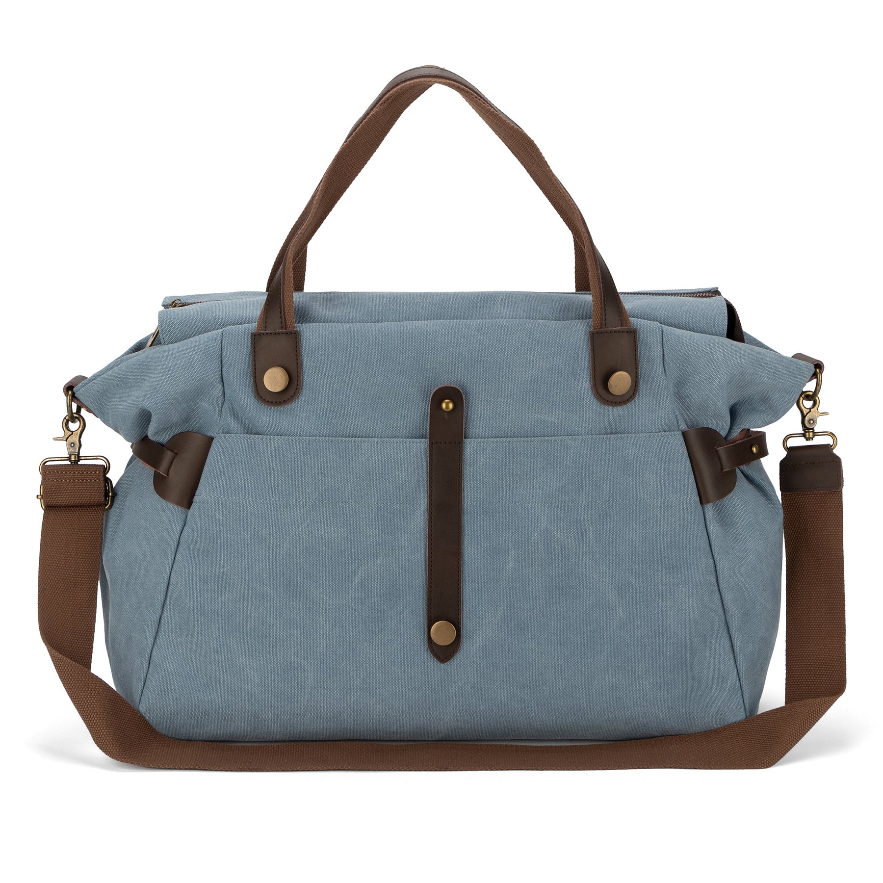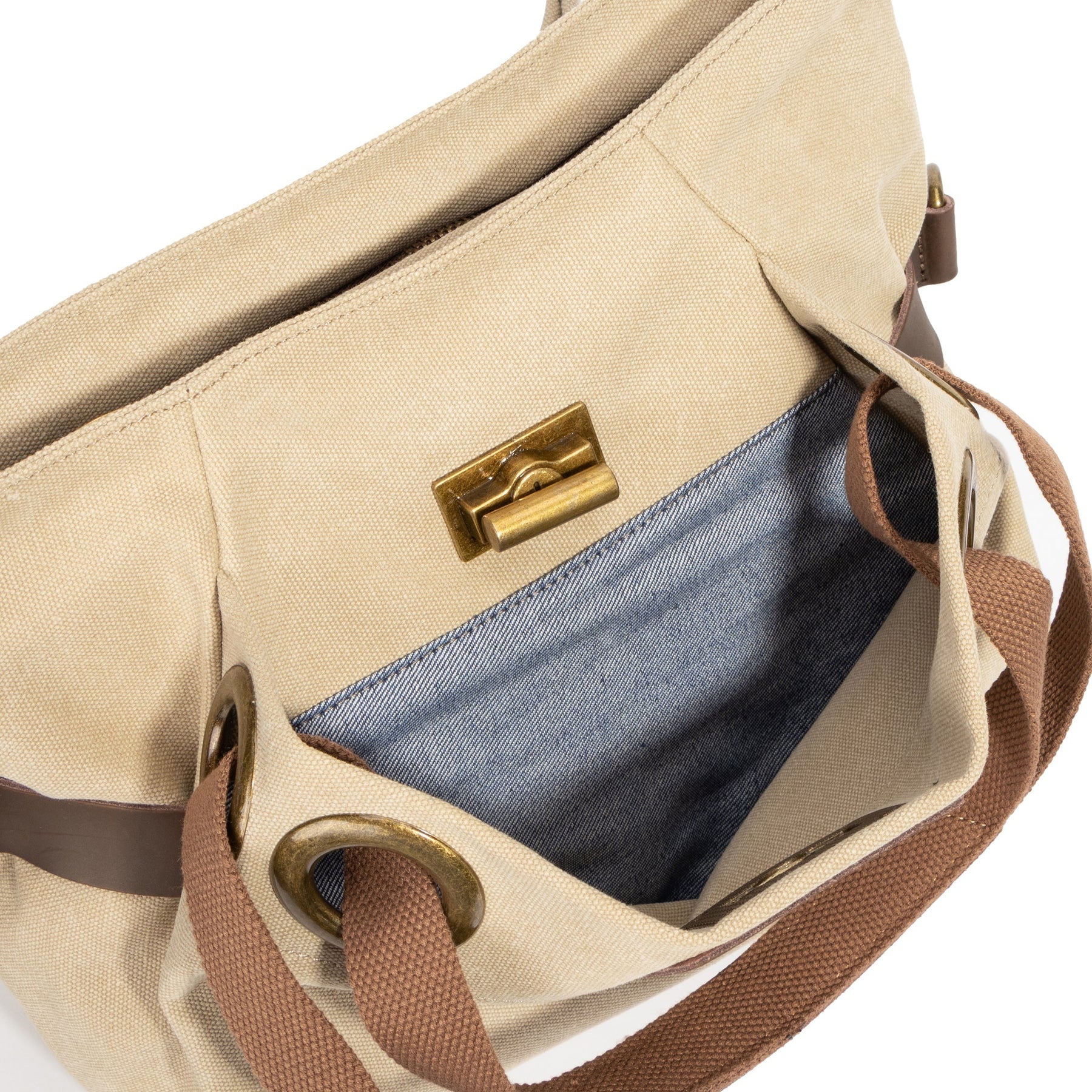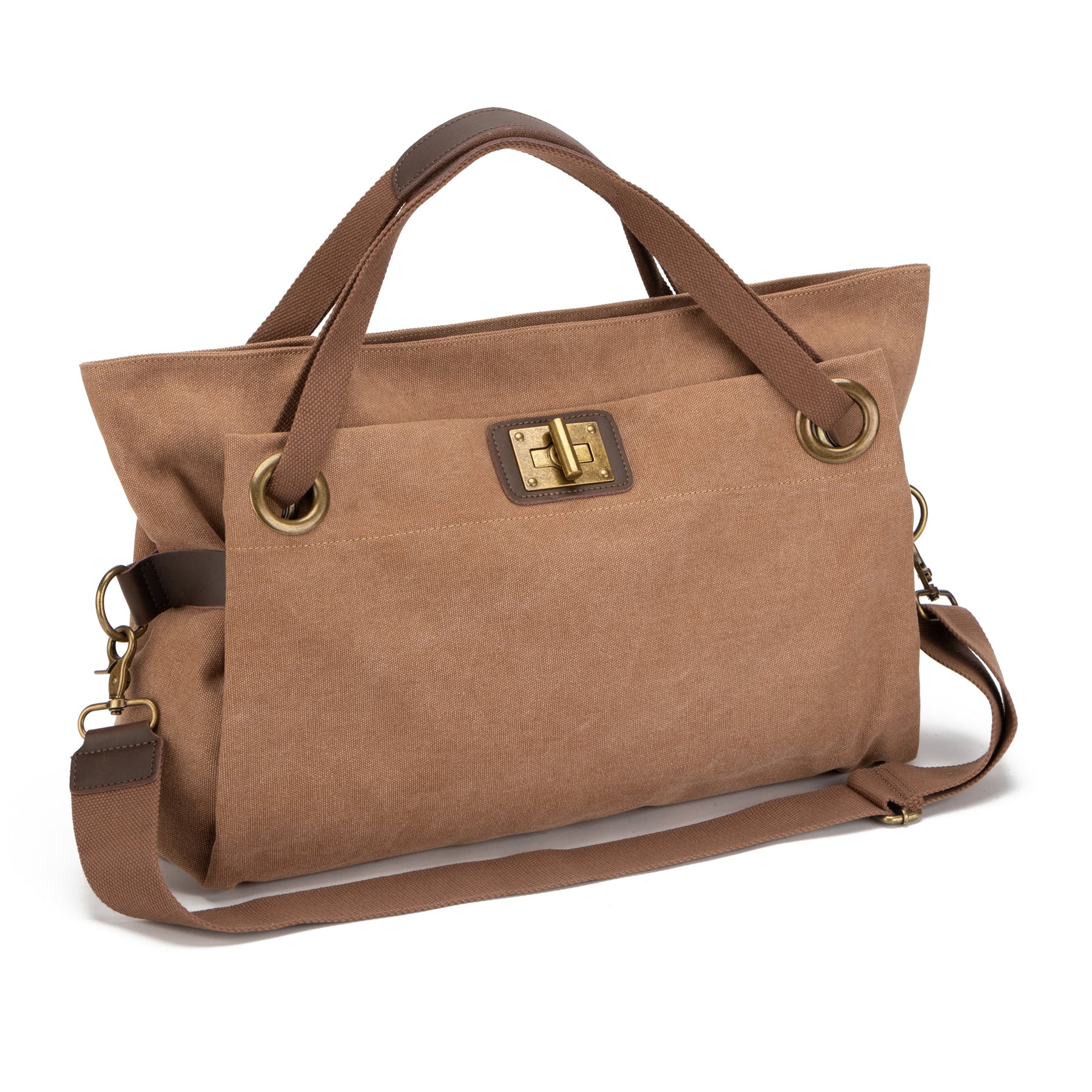Die Tasche aus gewaschener Baumwoll-Canvas und Spaltleder vereint Weichheit und Authentizität. Die Griffe aus einer Mischung aus Canvas und Leder sorgen für optimalen Tragekomfort. Im Inneren verfügt die Tasche über fünf Innentaschen, darunter zwei mit Reißverschluss, eine große Rückentasche mit Magnetverschluss und eine geräumige Fronttasche mit Knebelverschluss.